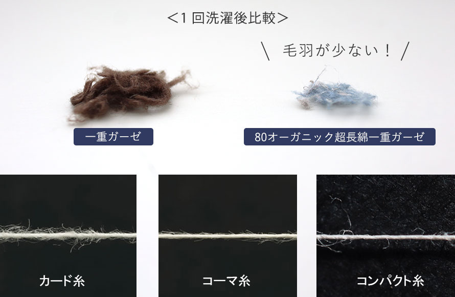 綿糸には「カード糸」「コーマ糸」「コンパクト糸(コンパクトヤーン)」という3種類があります。その中でも貴重な超長綿で作られる「コンパクト糸」は糸表面の毛羽を伏せて製造された綿糸で、通常の綿糸に比べて格段に毛羽が少なくきれいな表面感が特徴の最高級綿糸になります。ガーゼ生地の毛羽立ちが気になるという方にもおすすめです。