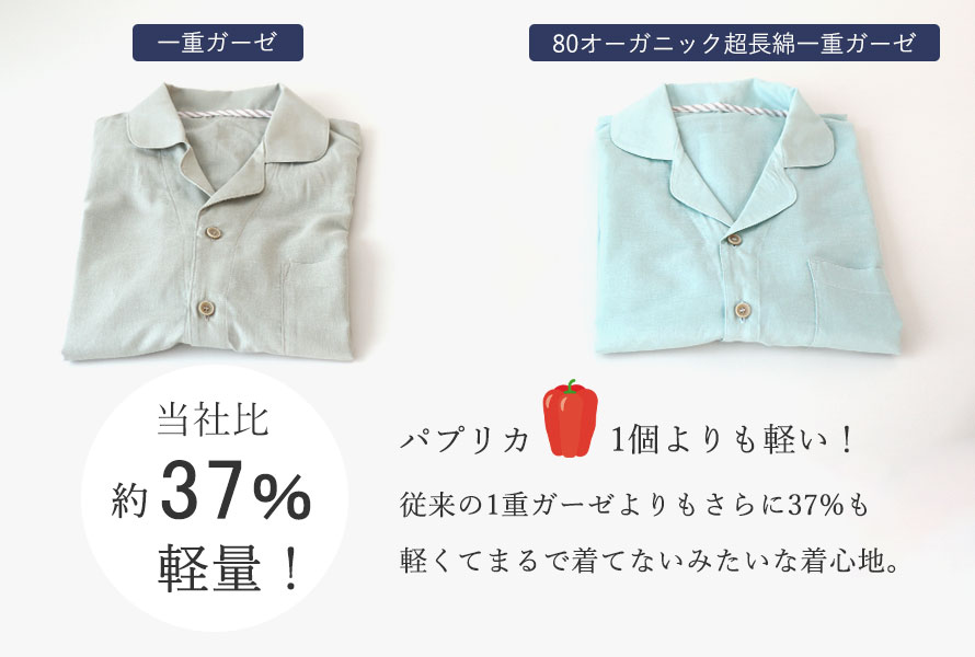 1重ガーゼに比べ約37%の軽量化を実現!極細の糸を使うことで今までになかった究極の軽さになりました。パプリカ1個分にも満たない軽さで、まるで着ていないかのようなストレスフリーな着心地に!