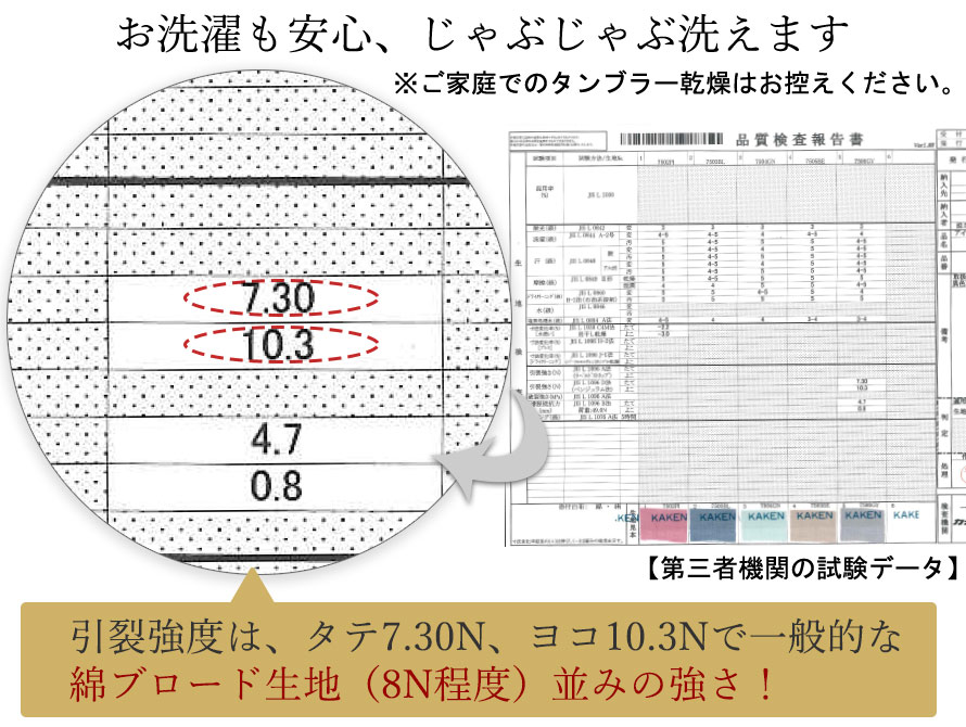 1重だと強度の面が心配というお声を頂きますが、ガーゼにもかかわらず、一般的な綿ブロード生地並みの強度という結果がでています。毛玉についても、ピリング試験も3.5級で一般基準程度で安心です。