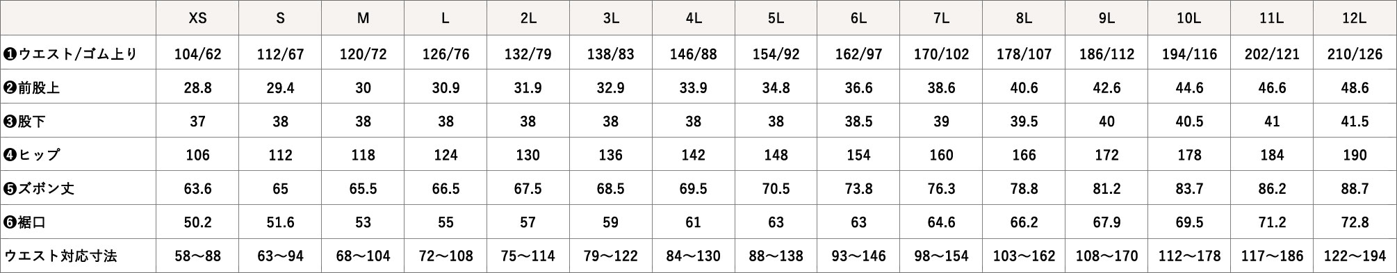 ズボンサイズ表のウェスト対応寸法やヒップのサイズから基本のサイズを選び、ウェストゴム上りをご覧下さい。