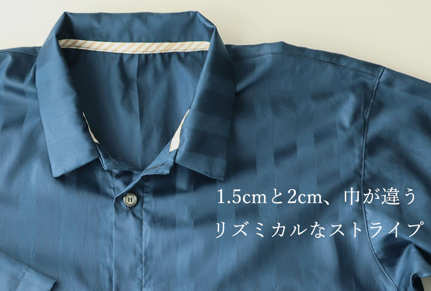 ラグジュアリーな雰囲気を演出するサテン織り(朱子織)は経糸と偉糸の交差する点をなるべく目立たぬように、さらにところどころを長く浮かせた織り方をすることで、平織などと比べ、光沢が出るので、ホテルのパジャマやリネンでよく使用さています。サテン織りとローン(平織)の幅をかえて、交互に織り上げたリズミカルなストライプは、光の加減によって複雑にみえ、大変高級感があります。シルクのようにギラギラしすぎない上品な光沢が魅力の綿サテンは、寝返りしやすく、パジャマにおすすめの素材です。