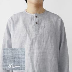 ちぢみ麻独特のシボ感が上品な印象を与えてくれます。ヘンリーネックの第一ボタンを開けても胸元が開きすぎずだらしなく見えません。涼しい夏のルームウェアとしてもおすすめです。