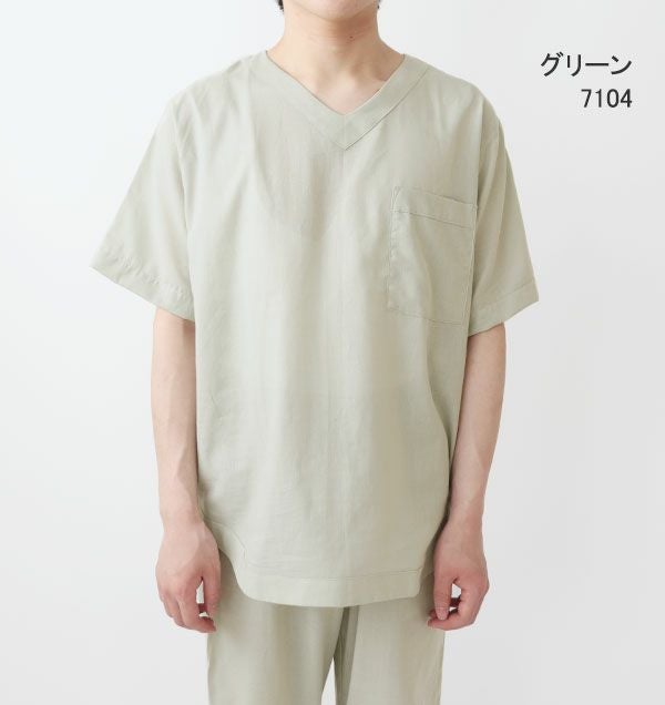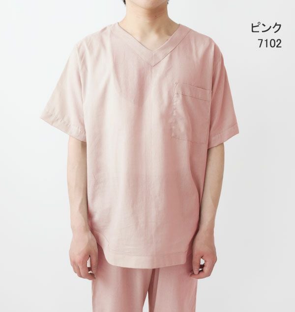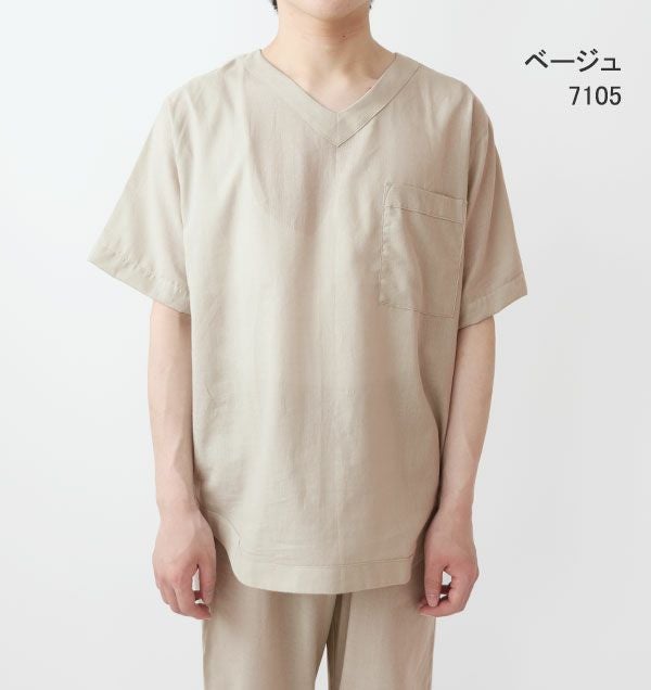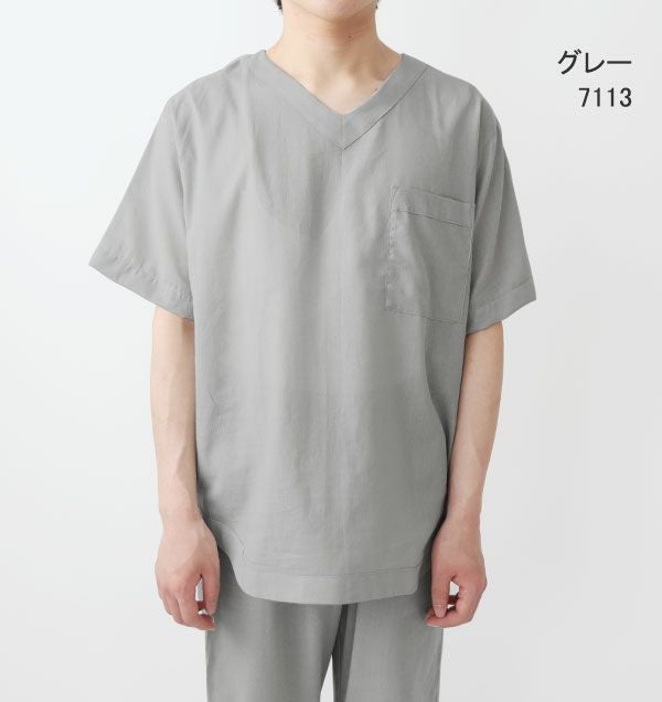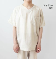部屋着、ルームウェア感覚で着られるVネックのパジャマのご要望を大変多く頂いておりました。どんな生地でもかぶりやすいサイズ感とVネックの開き具合に大変苦労しました。半袖でより涼しく着たいという方にぴったりなデザインです。
