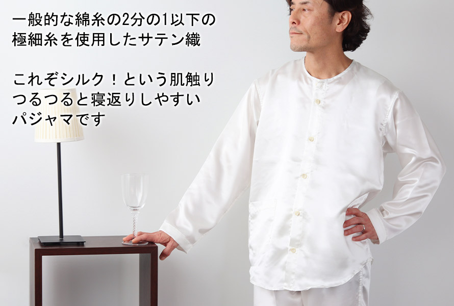 川俣シルクサテンメンズパジャマ上着単品・長袖/前開き/襟なし
