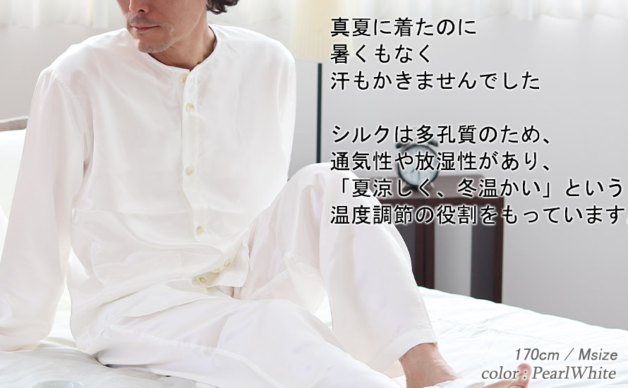 シルクは多孔質のため「夏涼しく、冬温かい」という温度調節の役割をもっています。綿に比べて吸水性、吸湿性が1.5倍でより蒸れを感じにくく、ほどよい保温性がありつつも、温度調整をしてくれるため、夏涼しく、冬温かい、一年中快適なノーカラーパジャマとなっています。