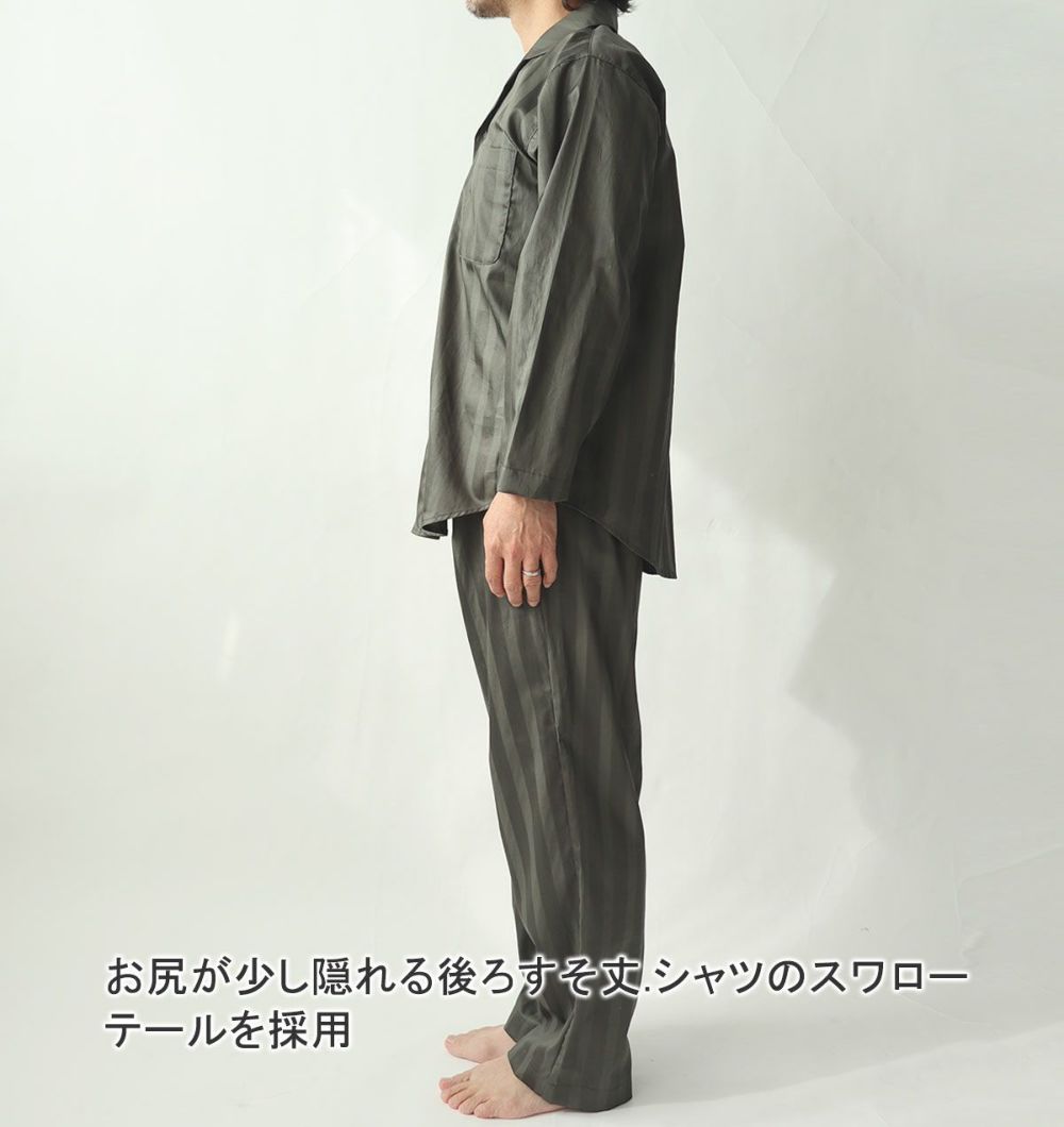 いろんなホテルでも採用されているサテンストライプ。ゆったりした首元の開襟デザインで、ホテルに滞在しているようなラグジュアリーなひとときを。