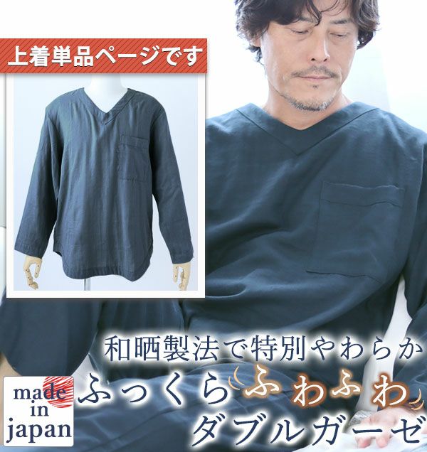昔ながらの和晒製法が生み出す特別な風合い 和晒京ふたえガーゼメンズパジャマ上着単品・長袖/かぶり/Vネック 【オーダーメイド】