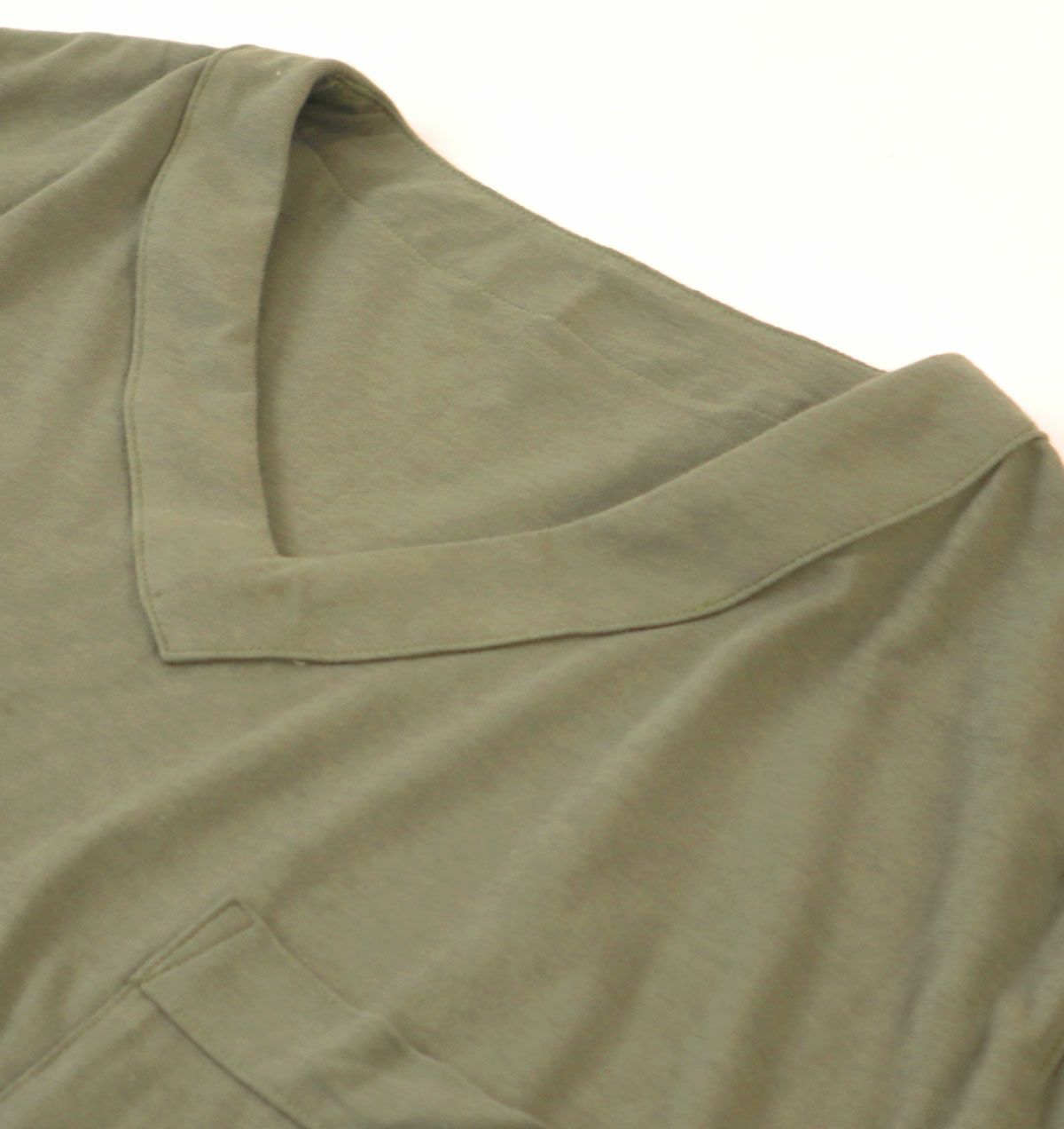 Tシャツとは違う1枚で大人っぽくおしゃれな印象になれるVネックデザイン。かぶりなので、突然の来客でも着脱しやすく部屋着、ルームウェアとしても最適の1枚です。オープン当初から一番ご要望が多かったのですが、首周りのサイズ感やおしゃれなデザインになるよう裾にもこだわり時間を頂きました。ストレッチがきいたニット生地ですので、部屋着にされても動きを制限せず快適です。