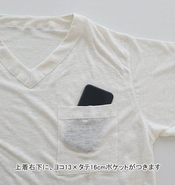 部屋着、ルームウェア感覚で着られるVネックのパジャマのご要望を大変多く頂いておりました。しゃがんでも胸が見えにくく、どんな生地でもかぶりやすいサイズ感とVネックの開き具合に大変苦労しました。