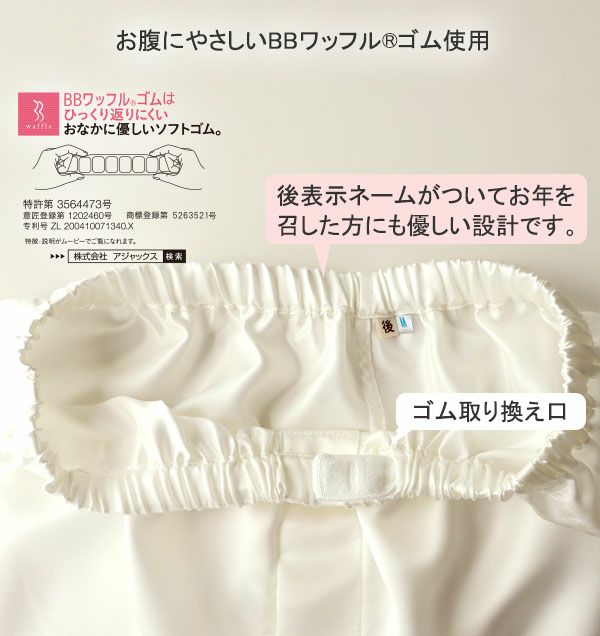 就寝中は締め付け感が少なくお腹にあたる部分もやさしい感触のものがおすすめです。当店で使用しているBBワッフル®ゴムは、ずれにくいのにきつすぎない、パジャマに最適なお腹にやさしいソフトゴムです。