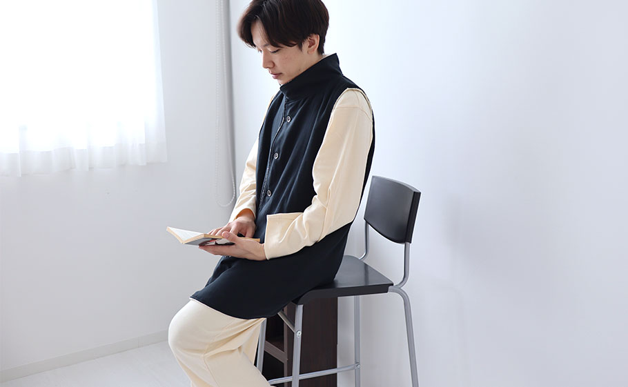 ガーゼといえば、洗濯するほど柔らかくなるのが特徴ですが、このガーゼは最初から使い込んだように柔らか。一般的な染色の約5倍以上の時間をかけた「液流晒」「液流染色」をすることで生地を傷めず、ガーゼ本来の風合いを存分に引き出しています。手間暇かけたこの工程の中で副産物的に生まれる独特のシボ感でくしゅっとした豊かな表情のベストになります。