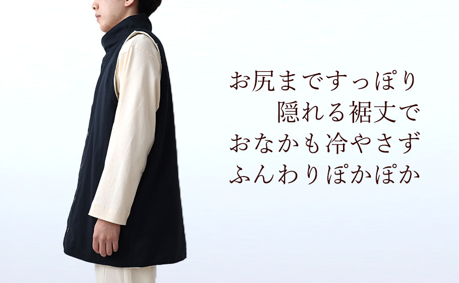 冬場は特に冷えやすいおなか。冷えないようしっかり防寒しつつも家事などがしやすいよう、動きやすい着丈にこだわりました。