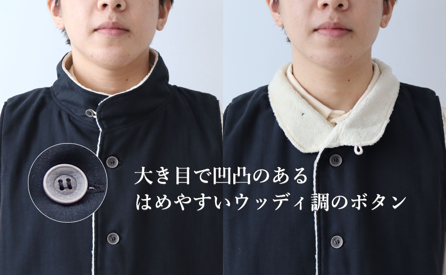 ベストといえば、ダウンのものが多いのですが、中からダウンが飛び出さない加工をされたもの(ダウンプルーフ加工)の生地はポリエステル等のシャリシャリと音がしたり、ヒンヤリ感じたり、蒸れたり羽毛の独特の匂いが気になる方も。次に多いのがフリースのベスト。初めはあったかいのですが、体温があがるにつれてムレてきて、知らず知らず寝ている間に脱いでしまうことも。また冬は静電気も気になりますね。このベストは綿100%でもしっかり防寒、肌がデリケートな方、ダウンやフリースの欠点が気になる方にぜひおすすめです!