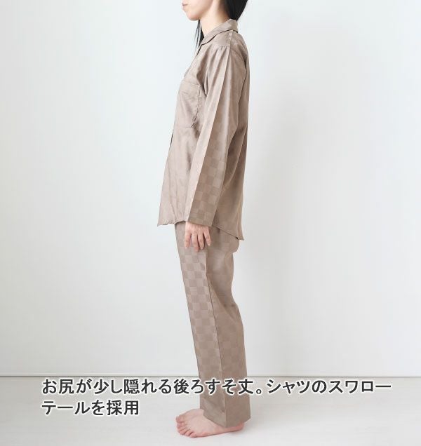使い勝手の良い長ズボン単品もブロックチェックサテンと合わせることで高級感があり上品な印象に。滑らかな肌ざわりと上品な格子柄が贅沢なひとときを演出してくれます。