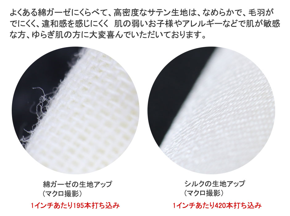 一般的なガーゼマスクは、拡大してみると微細な毛羽がでています。それが長時間お顔にあたると、かゆみなどの原因にも。改良版は裏も表もシルクサテンを使用し、毛羽がでにくく、ツルツルの肌触り。当店の一般的なガーゼでも1インチあたり195本ですが、シルクサテンは420本の打ち込みがあるのでとってもなめらか、肌に違和感が感じにくい生地なので、肌荒れしやすい季節の変わり目や不織布のマスクで肌が荒れて・・・とお悩みだったお客様、敏感肌の方にも喜んで頂いております。