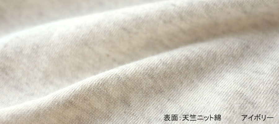 裏毛を起毛し、わた毛のようなふわふわした表情のある裏起毛になりました。表、中、裏の糸を全て30番手の細番手糸で編むことで、しなやかで肌にそっとよりそうようなフィット感と寝返りしやすい伸縮性を感じて頂けます。軽くて柔らかくあったかい・・・素肌にそのまま着ても 全くストレスを感じないくらい・・・。裏面を毛羽立たせた「裏起毛」は、まるで綿毛のようにふわっふわな肌触りが魅力です。