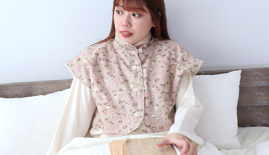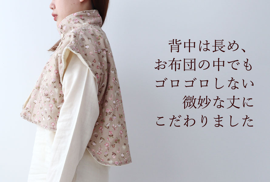 肩が隠れる長さでしっかり覆え、冬の寒さや夏のエアコンから、冷えた肩を温めます。寝返りで首元や肩が出てしまうと寝冷えや肩こりの原因にも。動いても安心のちょうどいいサイズ感に仕上げました。