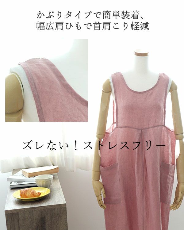 生地はクールクラッシュ加工という特別な加工を施したフランスリネン。高級な60番手糸で織りあげた生地は大変軽く、さらに加工でふわっとしておりお洋服にはりつかず、重ね着しているのに圧迫感なく疲れ知らず!またリネンは天然の防汚性、抗菌性がありエプロンには最適な素材です。
