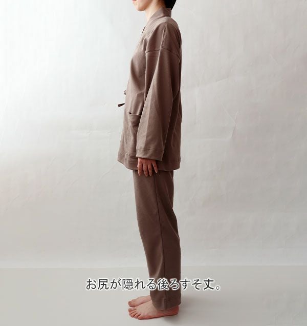 一般的な作務衣は7分丈のものが多いのですが、つくるパジャマの作務衣は上着は手首まで、ズボンも足首まである10分丈。朝晩の冷えから守ってくれるますますあったかな冬の作務衣に。オプションを選んで頂くと、作業がしやすいゴムも入れられます。ジャージよりきちんと感がでますので、ルームウェアやお散歩などの外出にも最適です。
