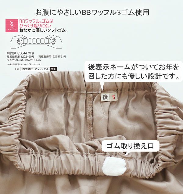 就寝中は締め付け感が少なくお腹にあたる部分もやさしい感触のものがおすすめです。当店で使用しているBBワッフル®ゴムは、ずれにくいのにきつすぎない、パジャマに最適なお腹にやさしいソフトゴムです。