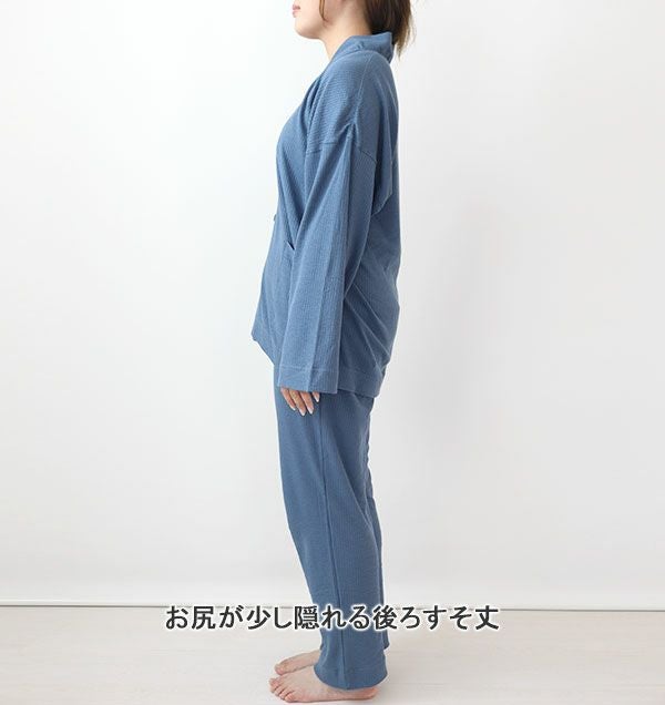 一般的な作務衣は7分丈のものが多いのですが、つくるパジャマの作務衣ズボンは足首まである10分丈。朝晩の冷えから守ってくれます。オプションを選んで頂くと、作業がしやすいゴムも入れられます