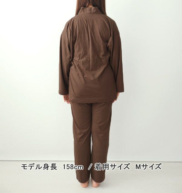 着脱しやすく窮屈すぎないデザインで1度着たら病みつきになる、1日中着ていたくなる着心地の作務衣です。コーディネートをしてちょっとした外出にも使え、ルームウェア、部屋着としても最適!内紐、外紐で調節できるので、体型の変化などにも対応できおすすめです。