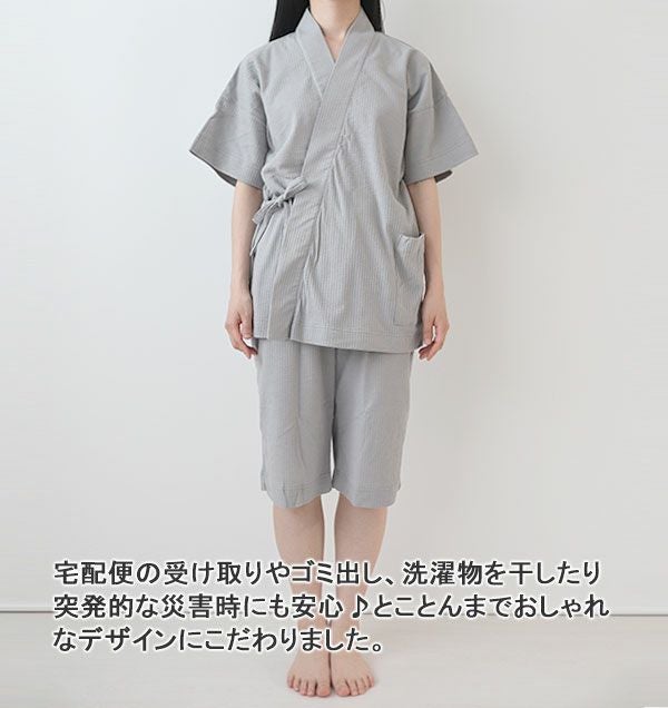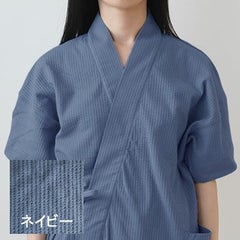 半袖、短パンでとっても涼しい甚平です。ニットサッカー特有の凹凸が肌との接地面積を減らしてくれるので、ニットだけど夏でも快適に。さらに伸縮性もあって動きやすい!ジャージよりきちんと感がでますので、ルームウェアに最適な甚平です。