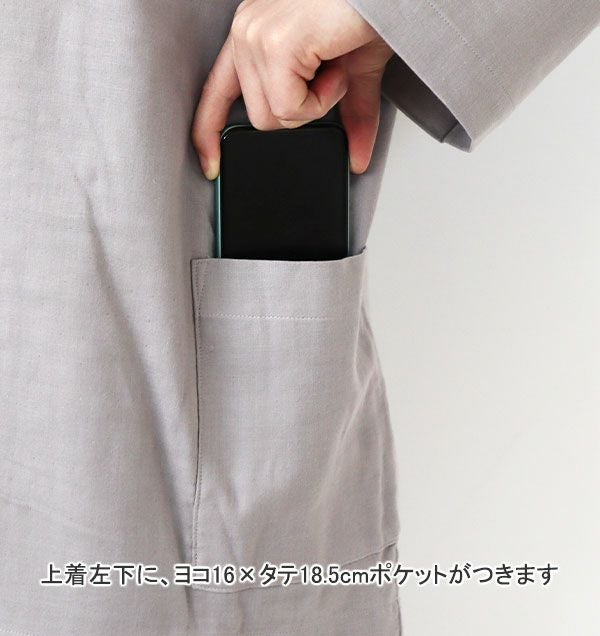 一般的な作務衣は7分丈のものが多いのですが、つくるパジャマの作務衣は上着は手首まで、ズボンも足首まである10分丈。オプションを選んで頂くと、作業がしやすいゴムも入れられます。ジャージよりきちんと感がでますので、ルームウェアやお散歩などの外出にも最適です。