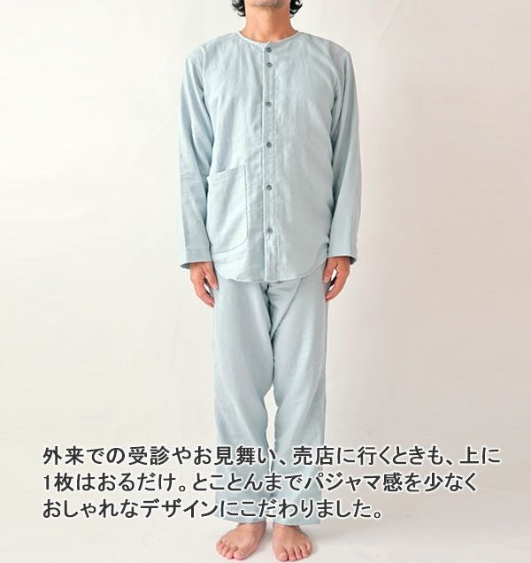 ふわふわ柔らかダブルガーゼのメンズ入院パジャマ 上下セット・長袖/前開き/襟なし