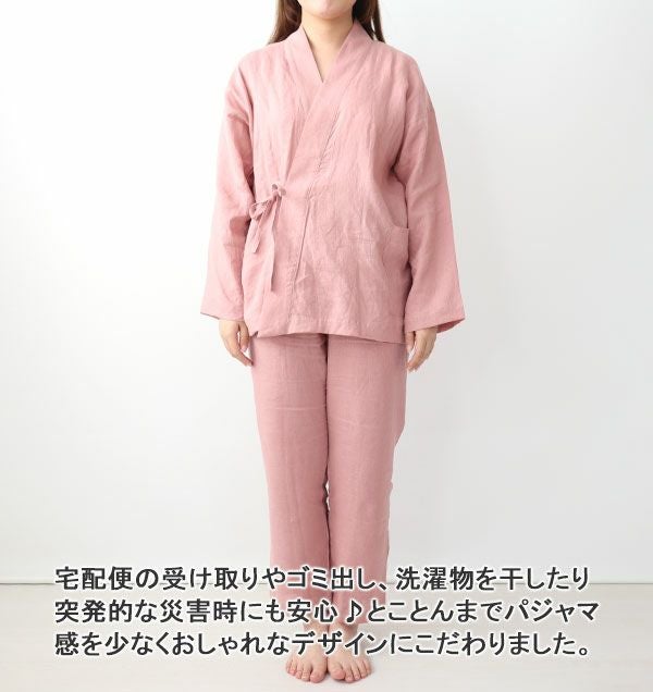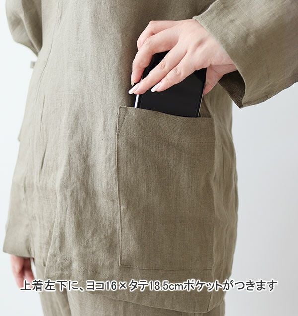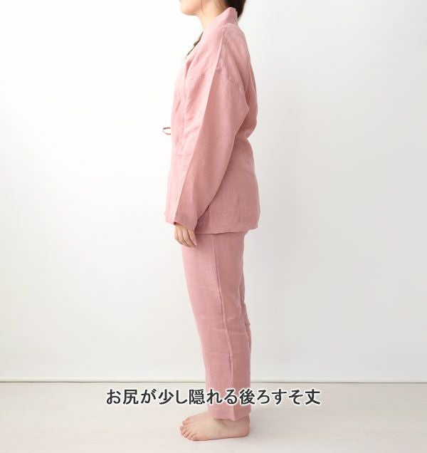 夏に人気の柔らかな肌触りが心地良いリネンのレディース作務衣上着単品の登場です!細い糸で織られているので、麻なのに軽くて快適なのが特徴です。おうち時間を充実したものにしてくれるルームウェアです。