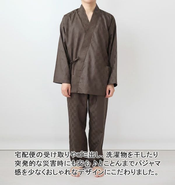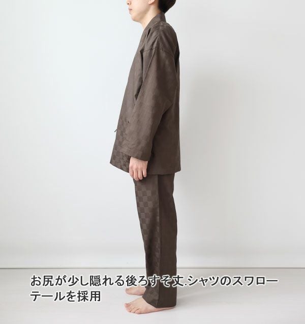 気持ち良い肌触りでおしゃれな格子柄が特徴のメンズ作務衣上着単品です!昼夜サテンならではの光沢のコントラスト美しい一枚です。安心安全の日本製で袖丈を調整できるセミオーダーメイド対応!