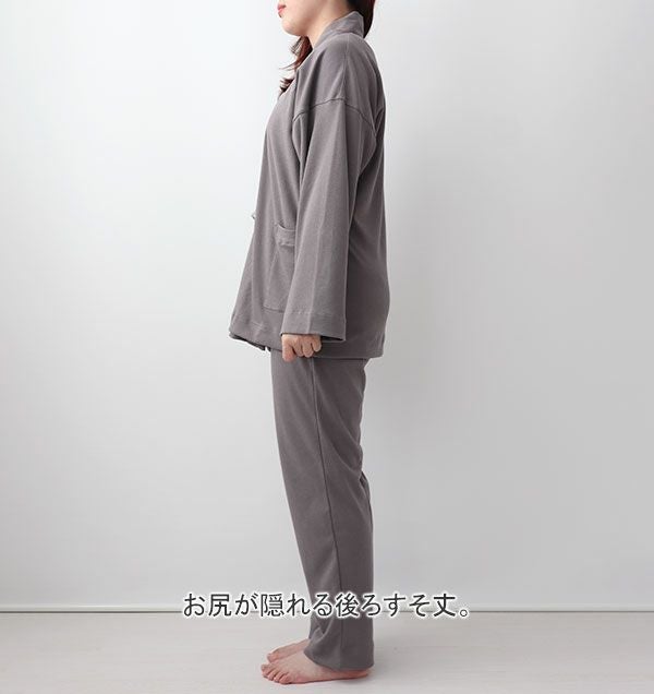 オーガニックコットン使用で地球環境にも優しく、柔らかで滑らかな肌触りのスムースニット生地からレディース作務衣上着単品のご紹介!ゆったりサイズで快適、ルームウェアやパジャマの上から羽織としてもお使いいただけます!