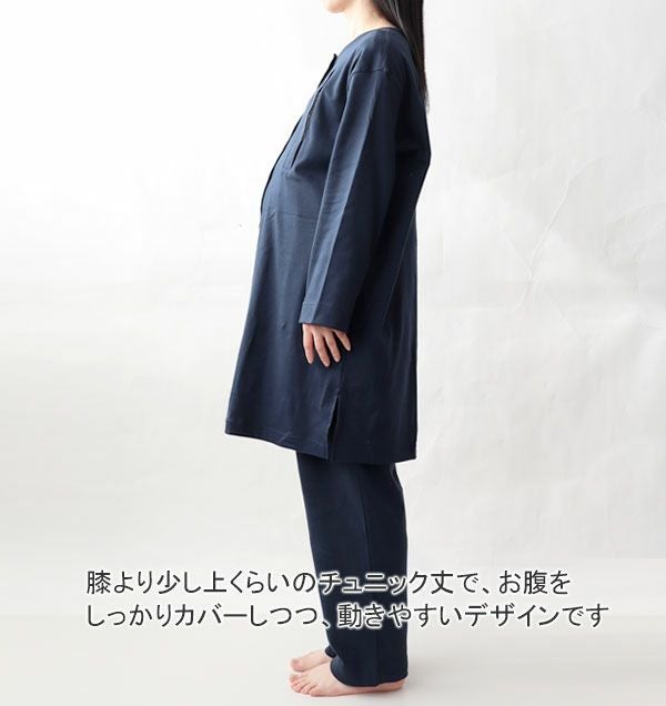 チュニック丈、授乳口がついた上着とアジャスター付きウェストゴムの股上深めのズボンで長く着て頂けます