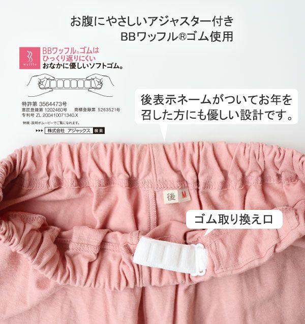 長さが調節できるアジャスターつき柔らかワッフルゴム。伸ばさない時は別布カバーに入れ込んで肌触りも違和感なく