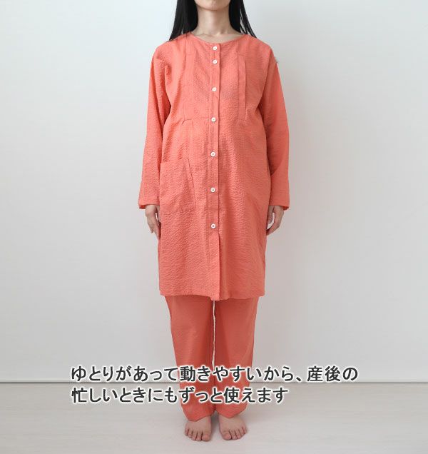| 仕様 | 長袖 前開き 襟なし チュニック丈 右腰ポケット 授乳口つき(スナップボタン3個ずつ) |