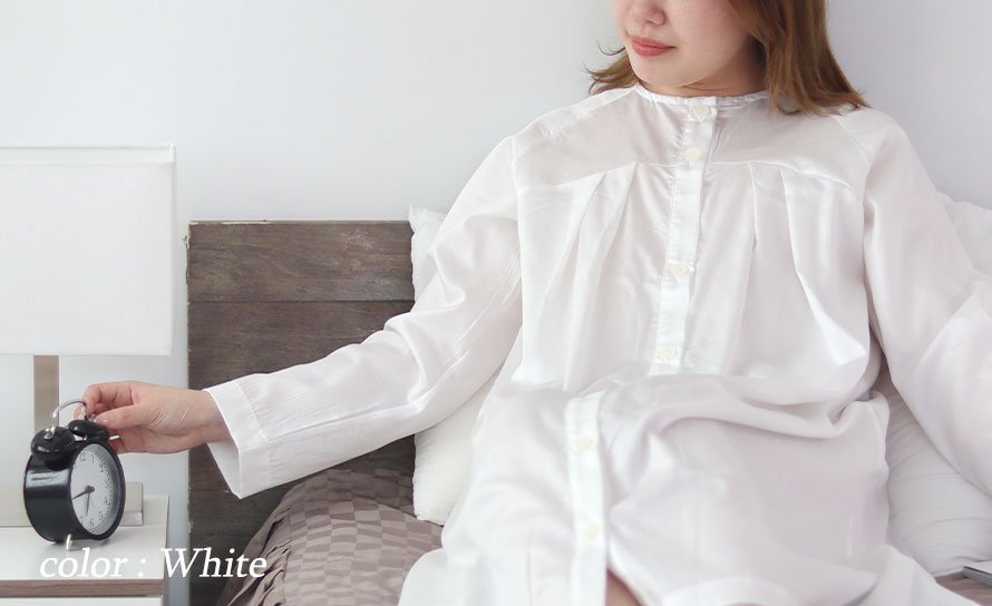超長綿ならではの光沢と肌触り 大人のサテンパジャマ スーピマ超長綿レディースワンピース・長袖/前開き/Aライン/胸元切替タック 【オーダーメイド】