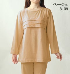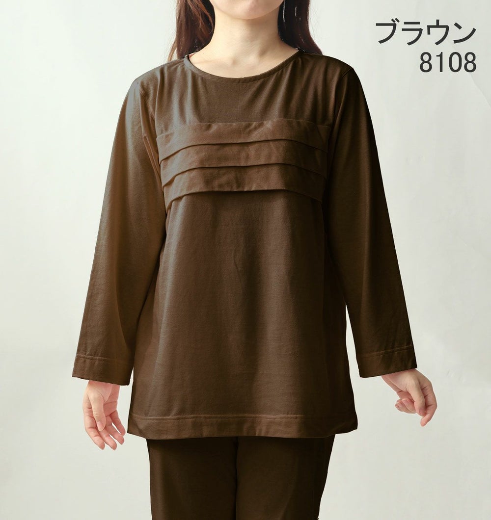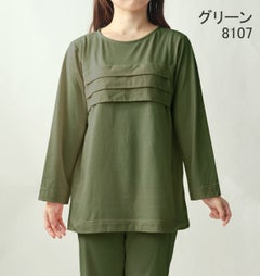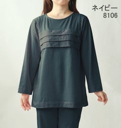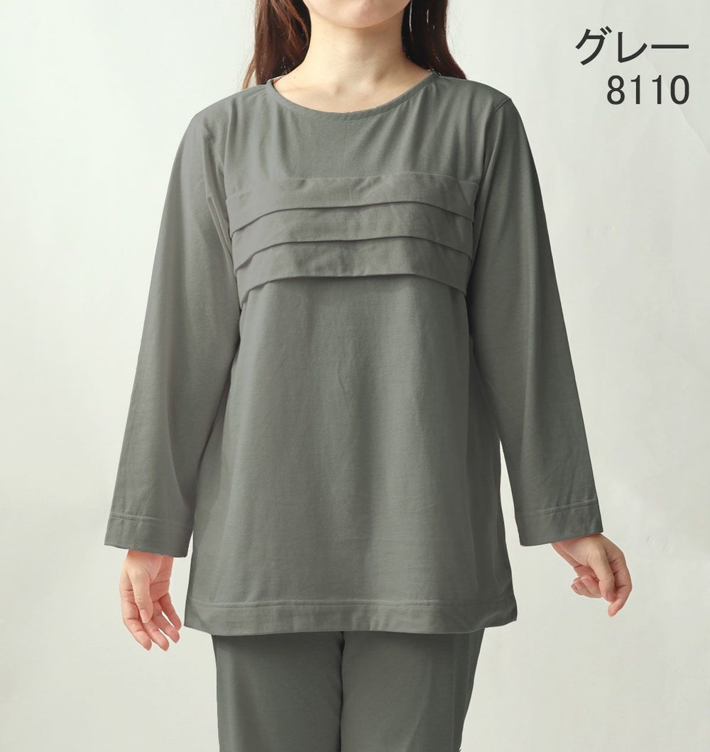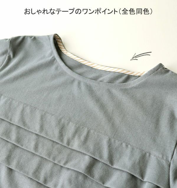 胸タック部分は後から付け足すわけではなく、1枚の布を切り出し、肌に直接あたる裏側まで縫い合わせなどの当たると不快に感じる部分を排除した、裁断士泣かせのデザインです。胸元が透けにくい三段タックは1枚でおしゃれでいて、かぶりなので、突然の来客でも着脱しやすく部屋着、ルームウェアとしても最適の1枚です。生地が2重になって凹凸や色も目立ちにくい、しかもかわいい三段タックデザインで1日中ずっと着ていたくなる動きやすいパジャマです。
