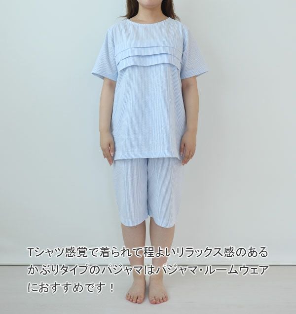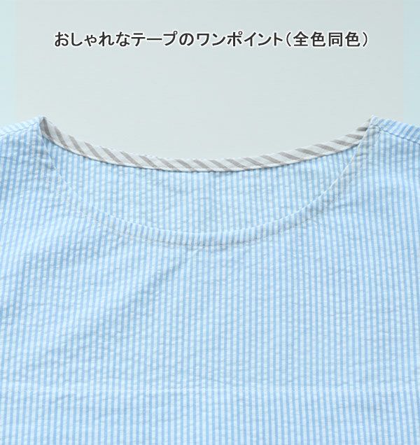 夏場は特に気になる胸元の透け感。かといってパッドつきのインナーは蒸れてしまう・・・当店の3段タックつきラウンドネックパジャマは、一枚で胸元が透けにくいから安心!さらに、夏にぴったりなサッカーストライプは、ぽこぽこした生地で汗をかいてもはりつかず、いつでもさらっと快適♪パジャマとしてはもちろん、部屋着・ルームウェアにもおすすめです。