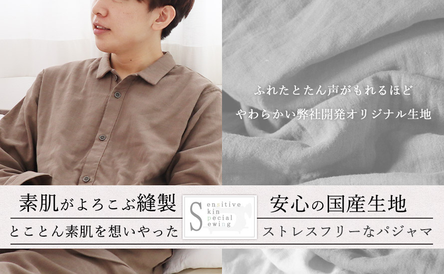 - つくるパジャマで使用する生地はほぼ全て織り、染めも日本で行った国産生地で、全て京都の自社工場で縫製しています。生地の開発、お客さまのご要望にきめこまかく対応し製造、出荷、アフターサービスまで一貫で行い責任をもつことで、お届けする商品には自信をもっております。自分たちの目の届くところで商品を作り、品質管理をし、改善を続けて参ります。