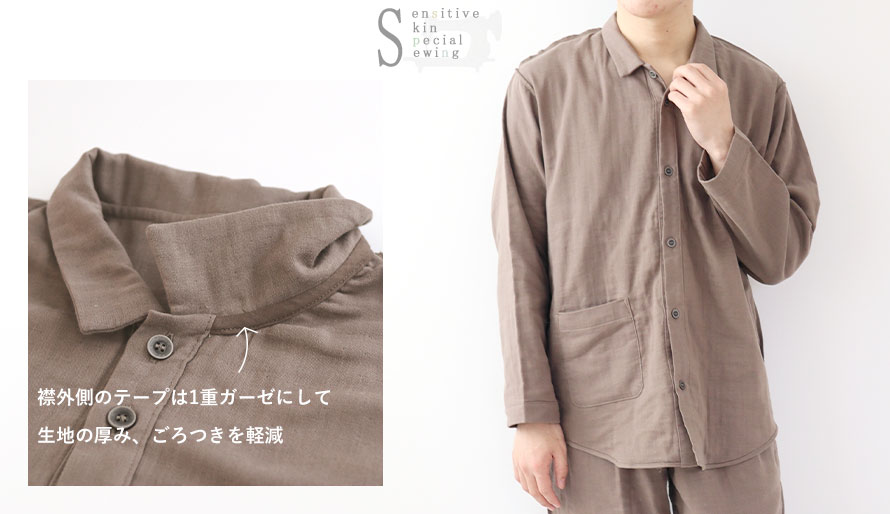 敏感肌用のパジャマはヌボーっとしたイメージになりがち。つくるパジャマではおしゃれなデザインはそのままで縫製を工夫しました。ベーシックな前開きのスモールカラーパジャマ。シャツのような襟ありデザインでパジャマ感が少なくおしゃれ♪上品な印象にきまるので、パジャマとしてだけでなく、ルームウェアにもおすすめです!3重ガーゼのふわふわの肌触りが素肌をやさしく包み込んでくれます。