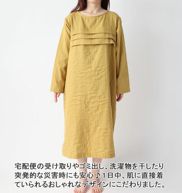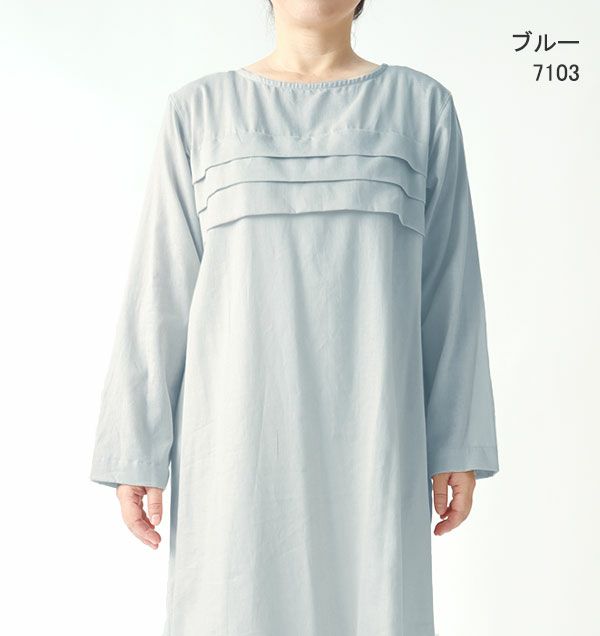レディースのラウンドネックワンピース。XS~5Lサイズまで。胸元のタックが女性らしさを演出しながら、透け防止と機能的。生地には和晒製法で特別ふっくら柔らかな綿ダブルガーゼを使用。適度な保温性で春・秋はもちろんオールシーズン活躍してくれます。