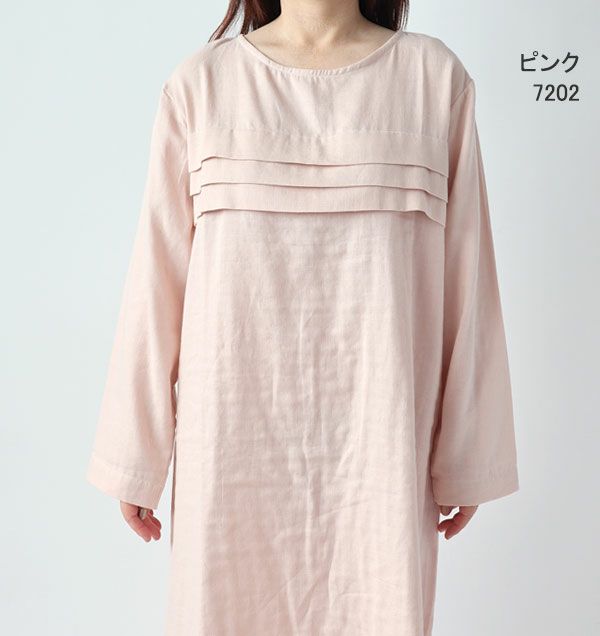 ふわふわ柔らかダブルガーゼレディースワンピース・長袖/かぶり/Aライン/胸元切替タック