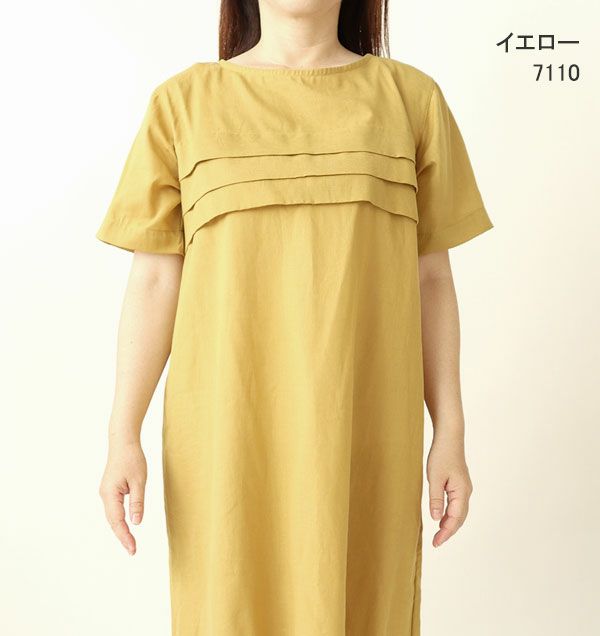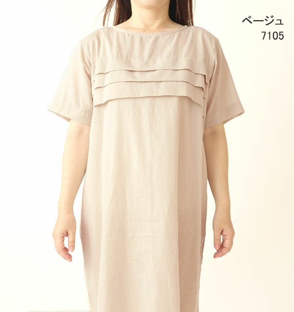 レディースのラウンドネックワンピース。XS~5Lサイズまで。胸元のタックが女性らしさを演出しながら、透け防止と機能的。生地には綿100%天竺ニットを使用。高級なTシャツのようなしっとり柔らかな肌触り、ほどよいストレッチ性で寝返りなども快適です。