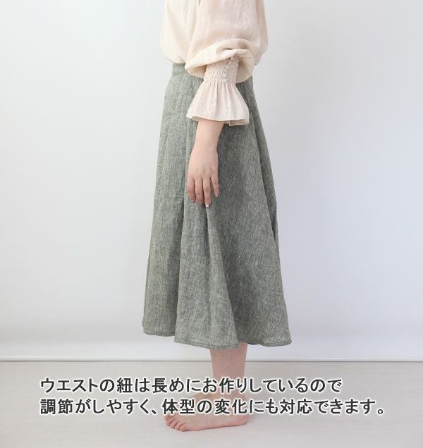 巻くだけで簡単に着られる巻きスカート。通常のパジャマよりたっぷり贅沢に生地を使用して、動くたび風をまとい、体型を拾わずふんわり広がります。おなか周りが目立たないよう、ほどよくボリュームを押さえる技ありのウエストタックで、どんな方も気軽に綺麗に着ることができます。ハリのあるリネン生地でお作りすることで、美しいドレープ性と落ち感がうまれます。