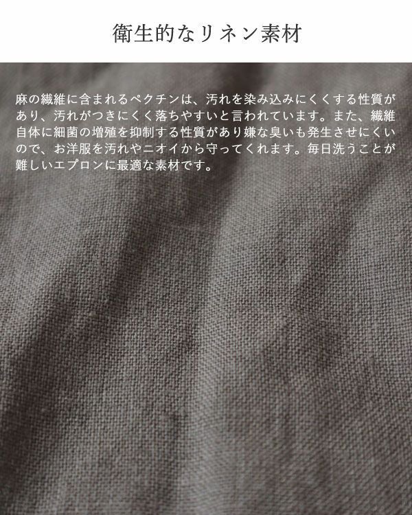 麻の繊維に含まれるペクチンは、汚れを染み込みにくくする性質があり、汚れがつきにくく落ちやすいと言われています。また、繊維自体に細菌の増殖を抑制する性質があり、嫌な臭いも発生させにくいので、お洋服を汚れやニオイから守ってくれます。毎日洗うことが難しいエプロンに最適な素材です。