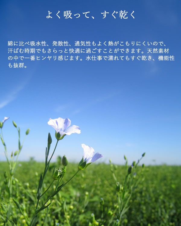 綿に比べ吸水性、発散性、通気性もよく熱がこもりにくいので、汗ばむ時期でもさらっと快適に過ごすことができます。天然素材の中で一番ヒンヤリ感じます。水仕事で濡れてもすぐ乾いてくれるので、機能性も抜群。