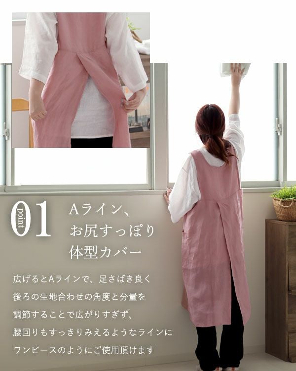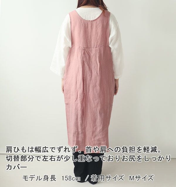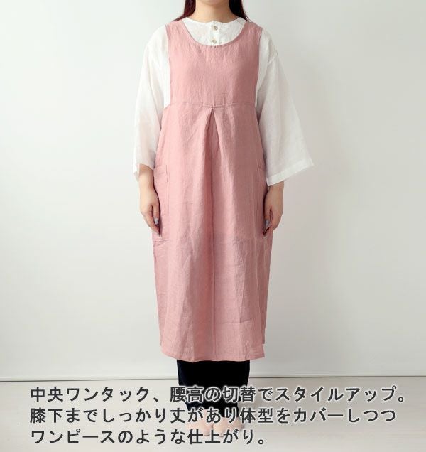 生地はクールクラッシュ加工という特別な加工を施したフランスリネン。高級な60番手糸で織りあげた生地は大変軽く、さらに加工でふわっとしておりお洋服にはりつかず、重ね着しているのに圧迫感なく疲れ知らず!またリネンは天然の防汚性、抗菌性がありエプロンには最適な素材です。