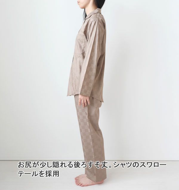 使い勝手の良い長ズボン単品もブロックチェックサテンと合わせることで高級感があり上品な印象に。滑らかな肌ざわりと上品な格子柄が贅沢なひとときを演出してくれます。