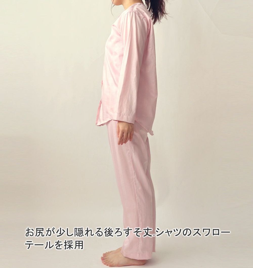 いろんなホテルでも採用されているサテンストライプ。ホテルに滞在しているようなラグジュアリーなひとときを。ズボンだけかえればゴミ出しはもちろん外出にも着ていけそうです!