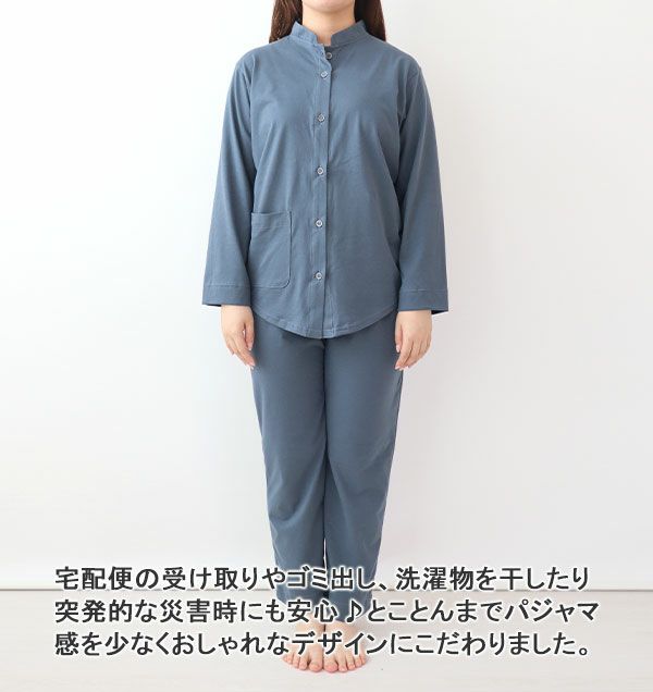 リラックス感たっぷりのストレッチ性が特徴の天竺ニットのレディースパジャマ上着です!おしゃれなバンドカラーで、下をお好みのズボンと合わせてルームウェアとしてもお楽しみいただけます!